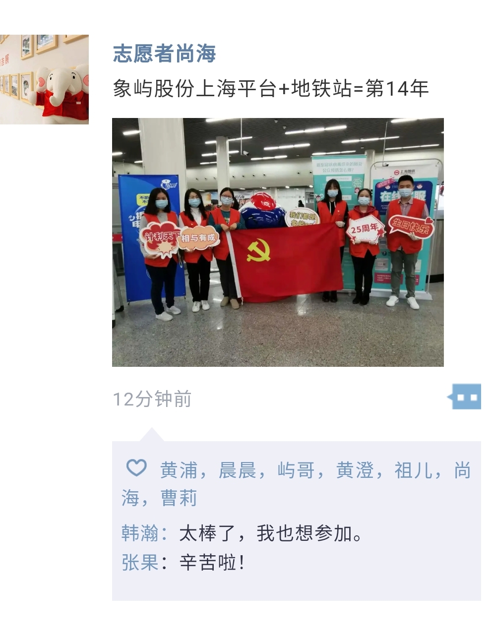 這是象嶼股份上海平臺志愿者走進地鐵站的第14個年頭。作為城市文明的先行者和宣傳者,志愿者們十四年如一日,堅持用真誠主動的服務(wù)為出行的乘客送上溫暖,讓“象嶼紅”成為地鐵站里一道亮麗的風(fēng)景線。