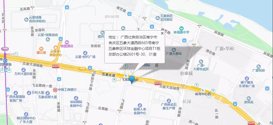 公司地址|廣西壯族自治區(qū)南寧市良慶區(qū)五象大道西段665號南寧五象新區(qū)環(huán)球金融中心項目T1棟總部辦公樓2601號-30、31室 |